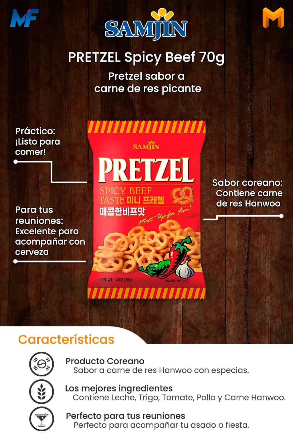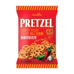 Botana de trigo horneada en forma de pretzel sabor a carne Hanwoo aderezada con ajo, chile y salsa de soya. Su sabor ligeramente picante combinado con su textura crujiente te encantará. Ideal para acompañar con la cerveza de tu gusto.