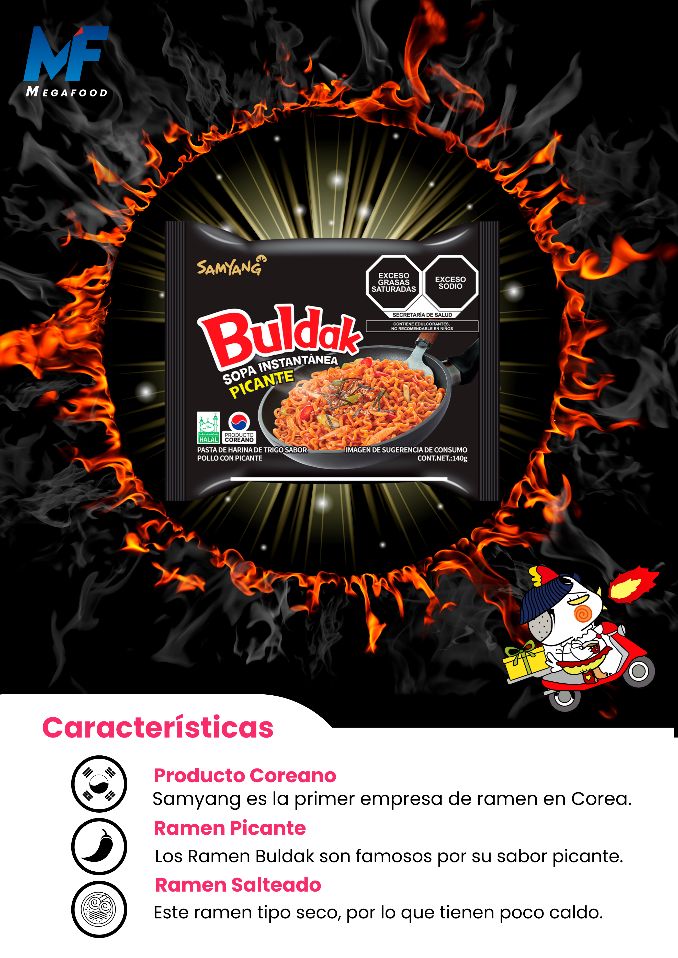 Fideos de harina de trigo previamente salteados, bañados en una exquisita salsa picante esta elaborada a base de aceite de guindilla, salsa shoyu, cebolla, puerro, sésamo tostado, pollo sabor curry y salsa picante gochujang. El paquete de condimento adicional está compuesto de algas secas y semillas de sésamo.